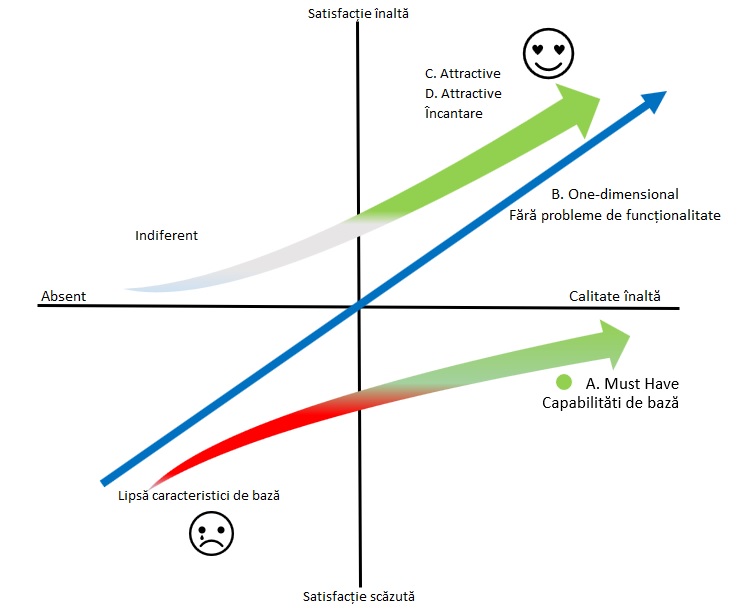 - Attractive (surprize plăcute): Caracteristici care nu sunt așteptate de clienți, dar care pot adăuga un plus de satisfacție dacă sunt prezente.